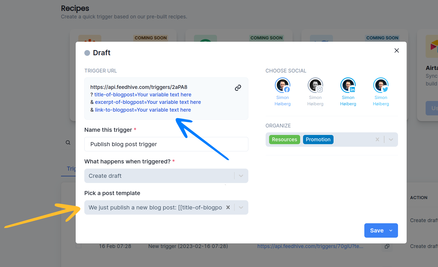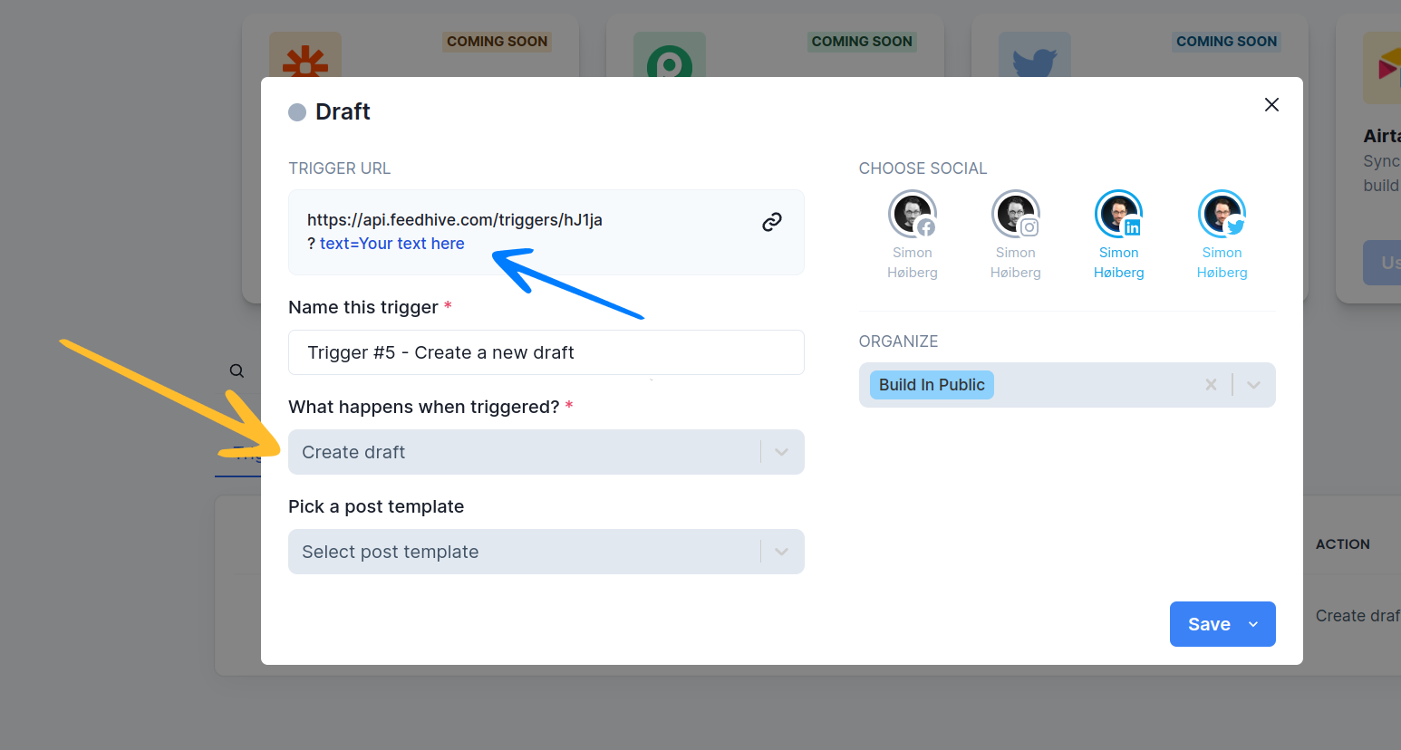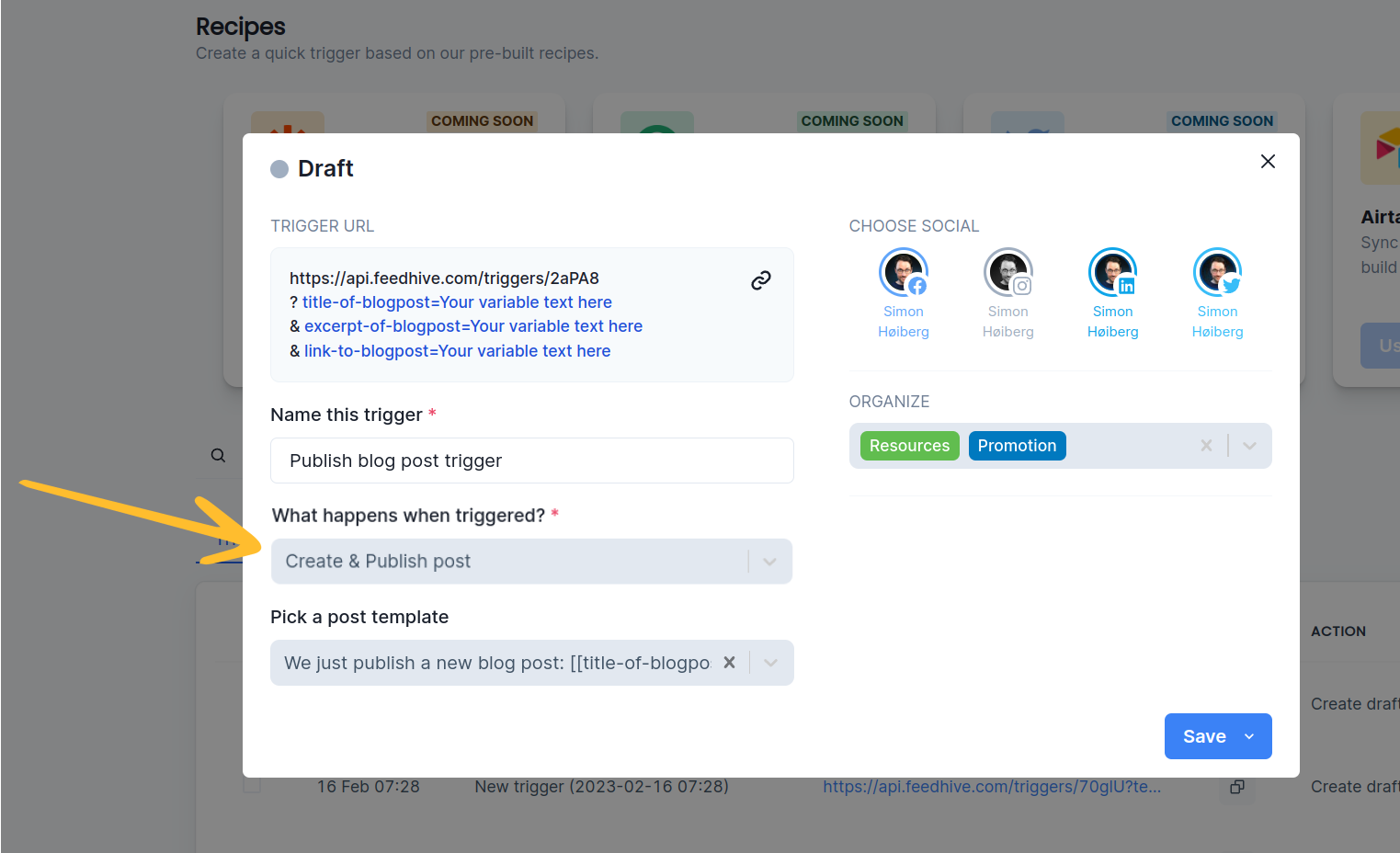 When setting up a trigger, we can pre-configure FeedHive to take certain actions which will happen when we call the URL that FeedHive creates for us.