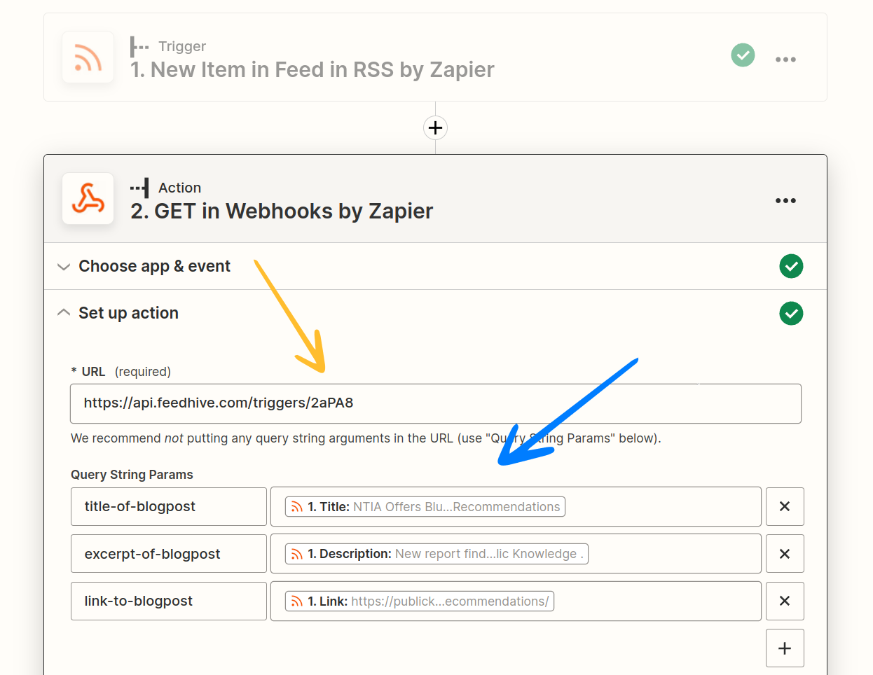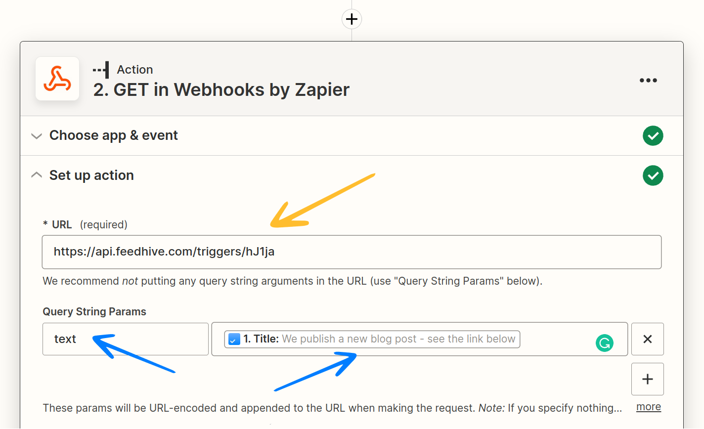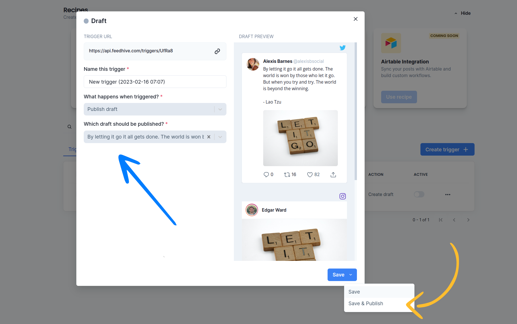 When setting up a trigger, we can pre-configure FeedHive to take certain actions which will happen when we call the URL that FeedHive creates for us.