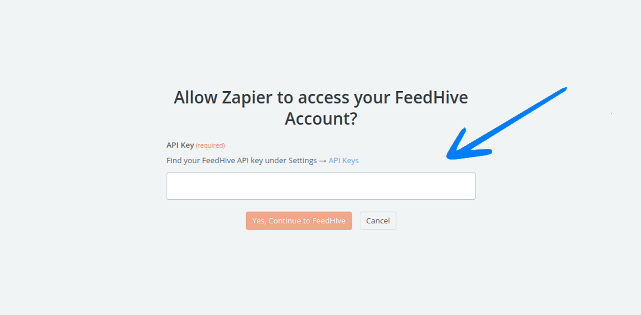 When Zapier asks you to sign into your FeedHive account, add the API key you just created here, then click Yes, Continue to FeedHive.