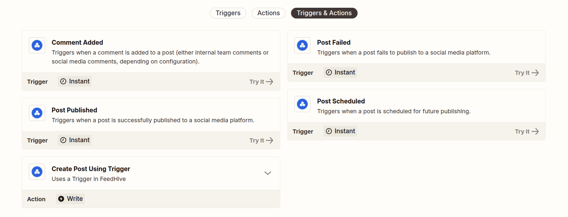 Zapier has a range of different actions and triggers, tailored specifically to FeedHive (opens in a new tab). This opens a whole world of possibilities in integrations and automation.
