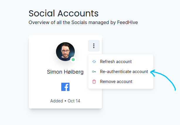 Sometimes your Facebook or Instagram accounts gets disconnected, new permissions are needed, or you need to add new pages or groups.