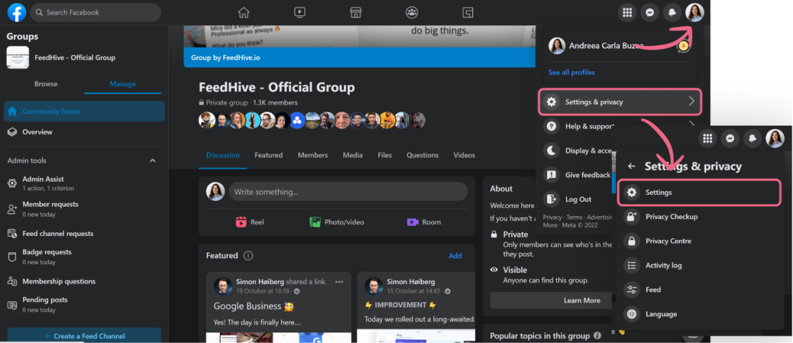 - Select Settings & privacy > Settings from the small drop down arrow at the upper right on your screen.
