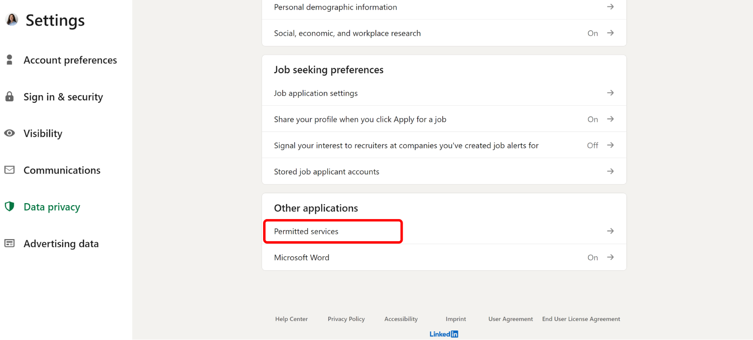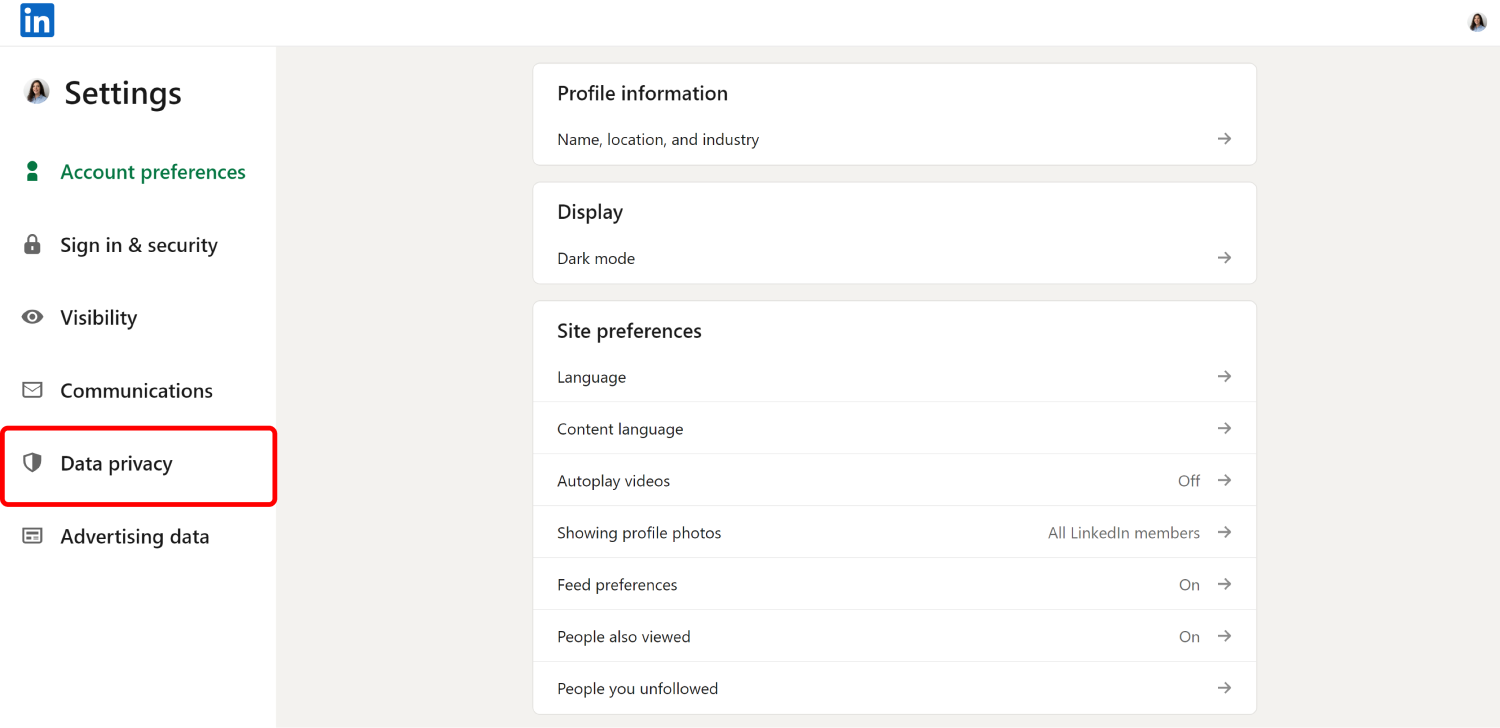 - Go to your Linkedin profile, click on your profile image in the top right, select Settings and Privacy, then go to Data Privacy.