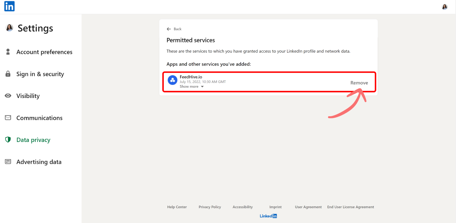 Sometimes re-authenticating through FeedHive alone isn't enough and you will have to disconnect directly from LinkedIn. This helps reset the connection completely.