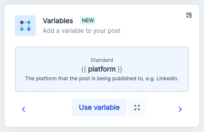 {{platform}} - This variable translates into the platform the post is published to. E.g., "Hi, {{platform}}" will translate to "Hi, Twitter" when posted on Twitter and "Hi, Facebook" when posted on Facebook.