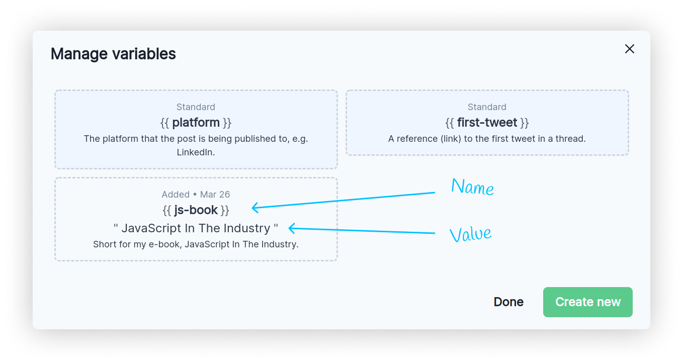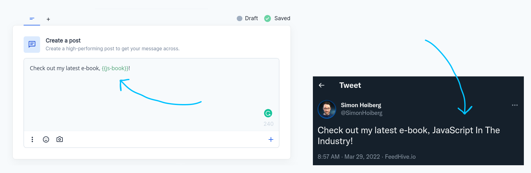 With FeedHive, you can use variables in your posts, which translate into a given value (piece of text) at the time when the post goes live.