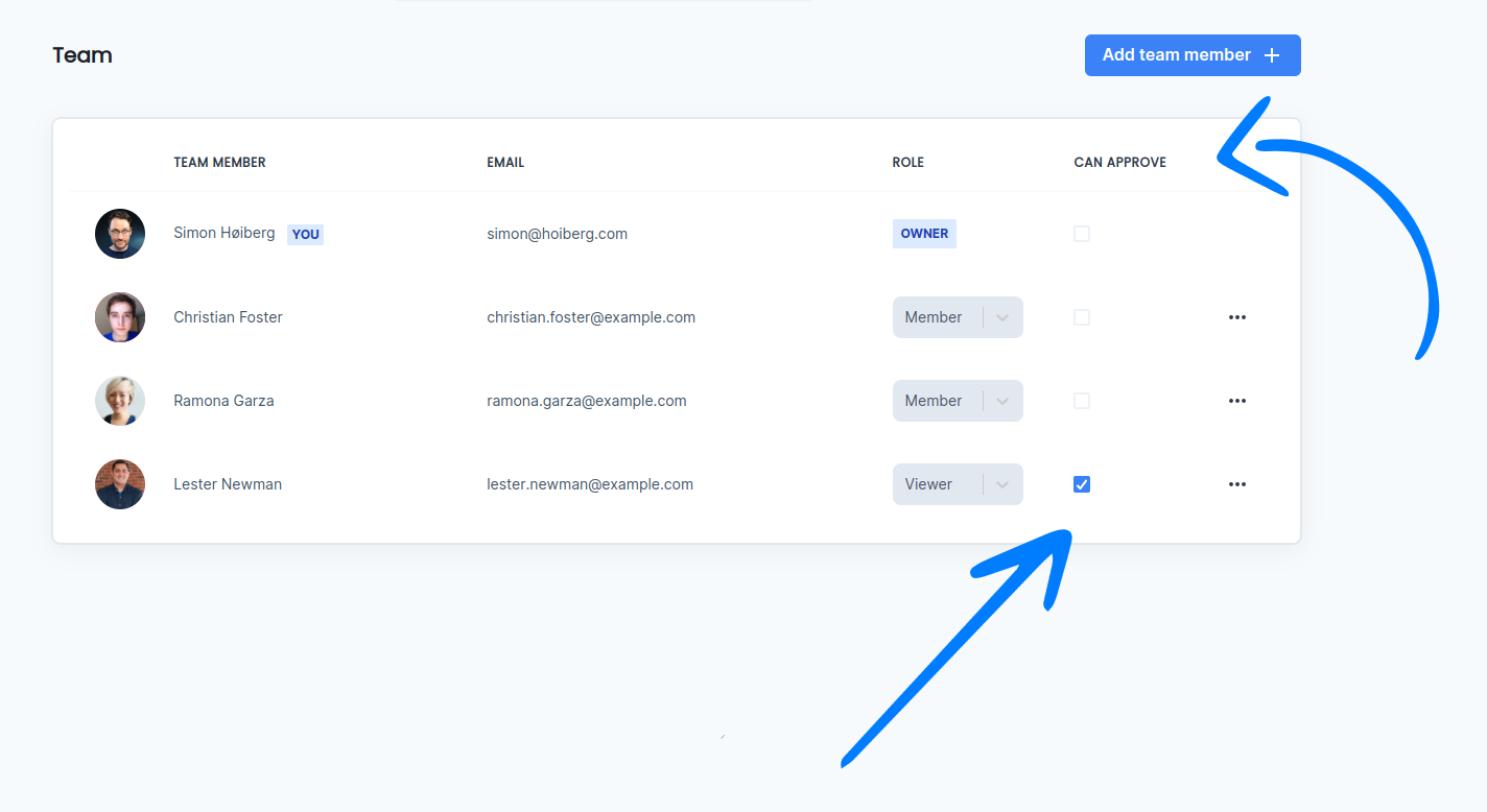 On the Teams page, you will see a new column, "Can approve", which you can use to grant team members the ability to approve.