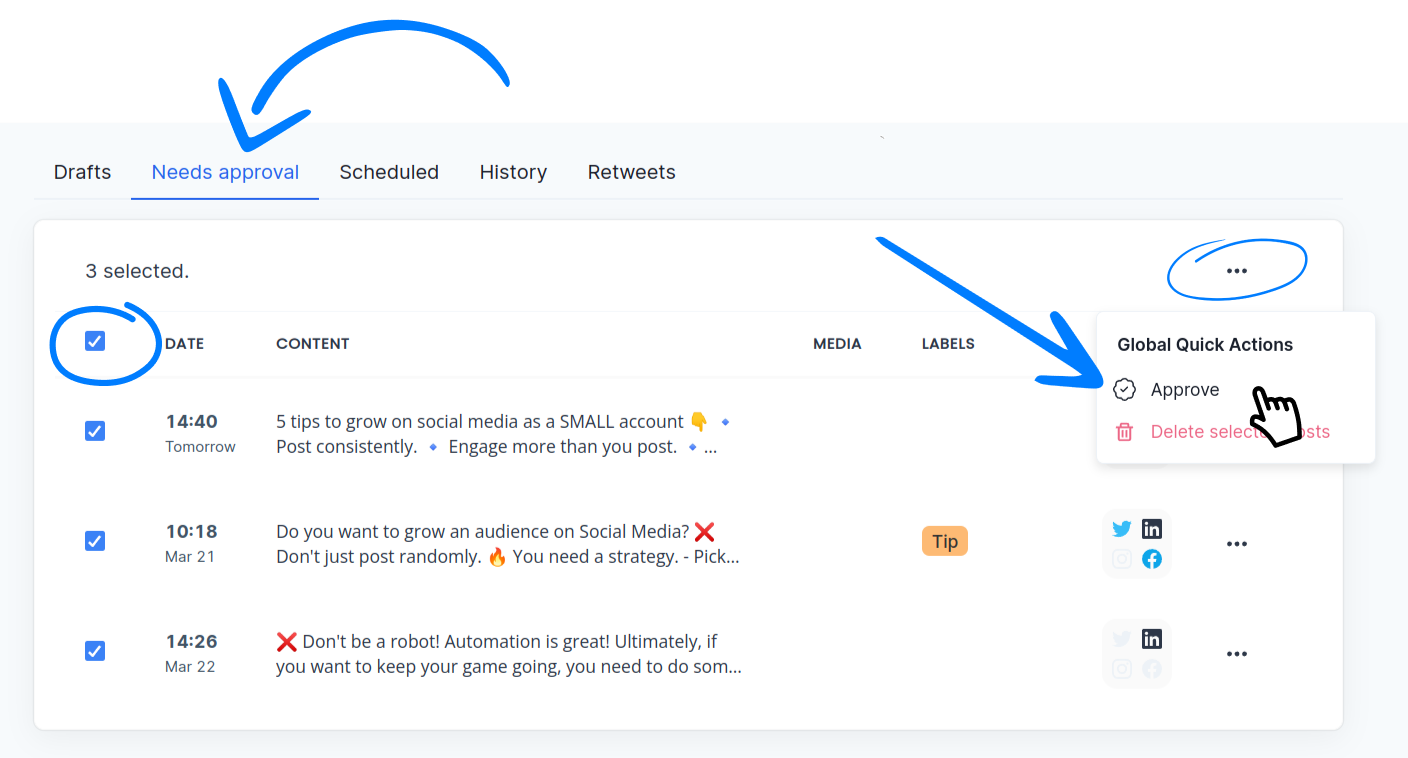 - You can select multiple posts, then click the "..." button on the top row and pick Approve.